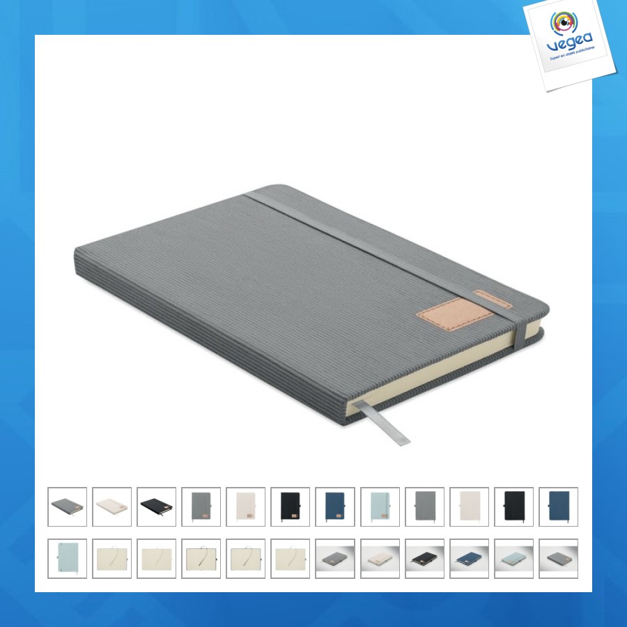 Carnet A5 avec couverture rigide en velours côtelé de polyester rPET et 192 pages lignées en papier recyclé (70 gr/m2). Reliure élastique, passant stylo, marque-page et étiquette en papier kraft.