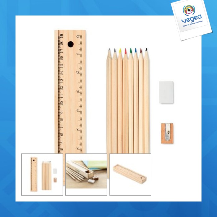 Découvrez l'ensemble de 12 crayons en bois personnalisé pour une écriture durable et stylée. Ce kit polyvalent inclut 2 crayons bois, 6 crayons de couleurs, 1 taille-crayon, 1 gomme, et une règle-couvercle pour l'étui en bois. Idéal pour les amateurs de stylo-bille, il offre une expérience d'écriture unique, tout en ajoutant une touche personnelle à vos fournitures publicitaires.