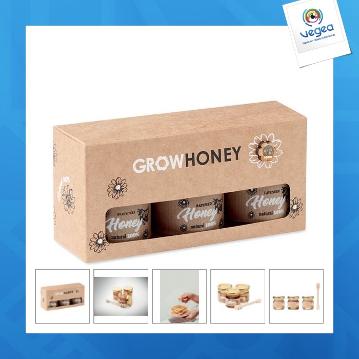 - Comprend trois pots de miel naturel : mille fleurs, lavande et colza