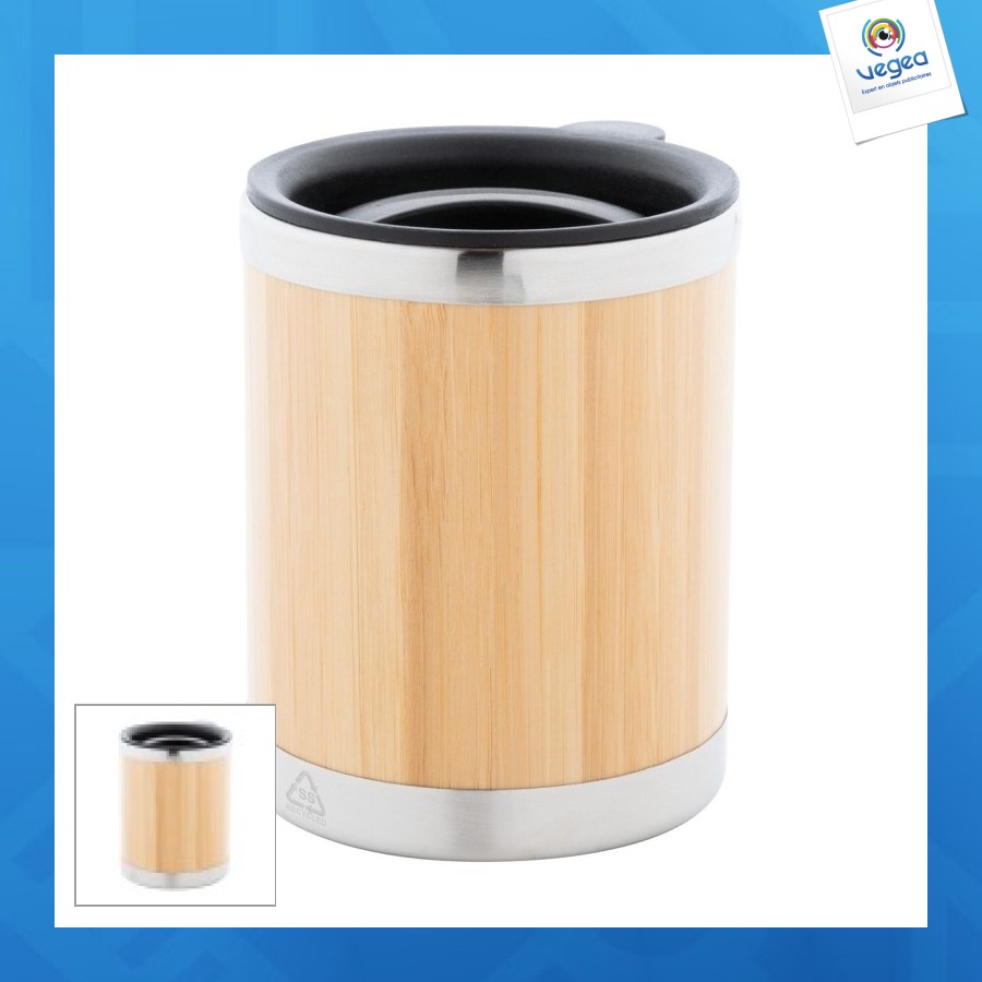 Mug thermos isotherme en acier inoxydable recyclé à double paroi recouvert de bambou avec bec verseur en PP, 300ml.