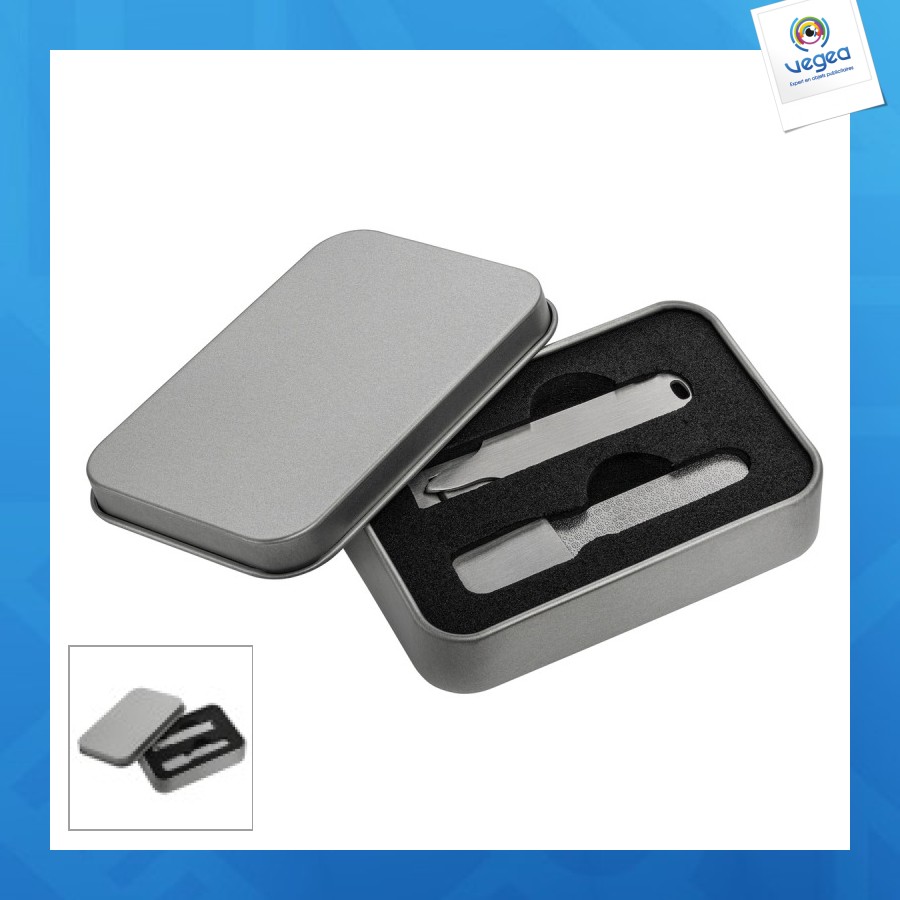 Ce set de manucure de haute qualité est parfait pour les déplacements ou les voyages. Il comprend une lime à ongles en acier inoxydable et un coupe-ongles. La lime à ongles double face est munie d'une poignée large pour une utilisation confortable. Le coupe-ongles est équipé d'une lime à ongles supplémentaire et s'ouvre facilement en appuyant sur la boucle. Le boîtier solide avec insert en mousse assure un rangement sécurisé des outils. La boîte peut être personnalisée par tampographie, gravure laser ou impression UV, tandis que le coupe-ongles et la lime à ongles sont adaptés à la gravure au laser.