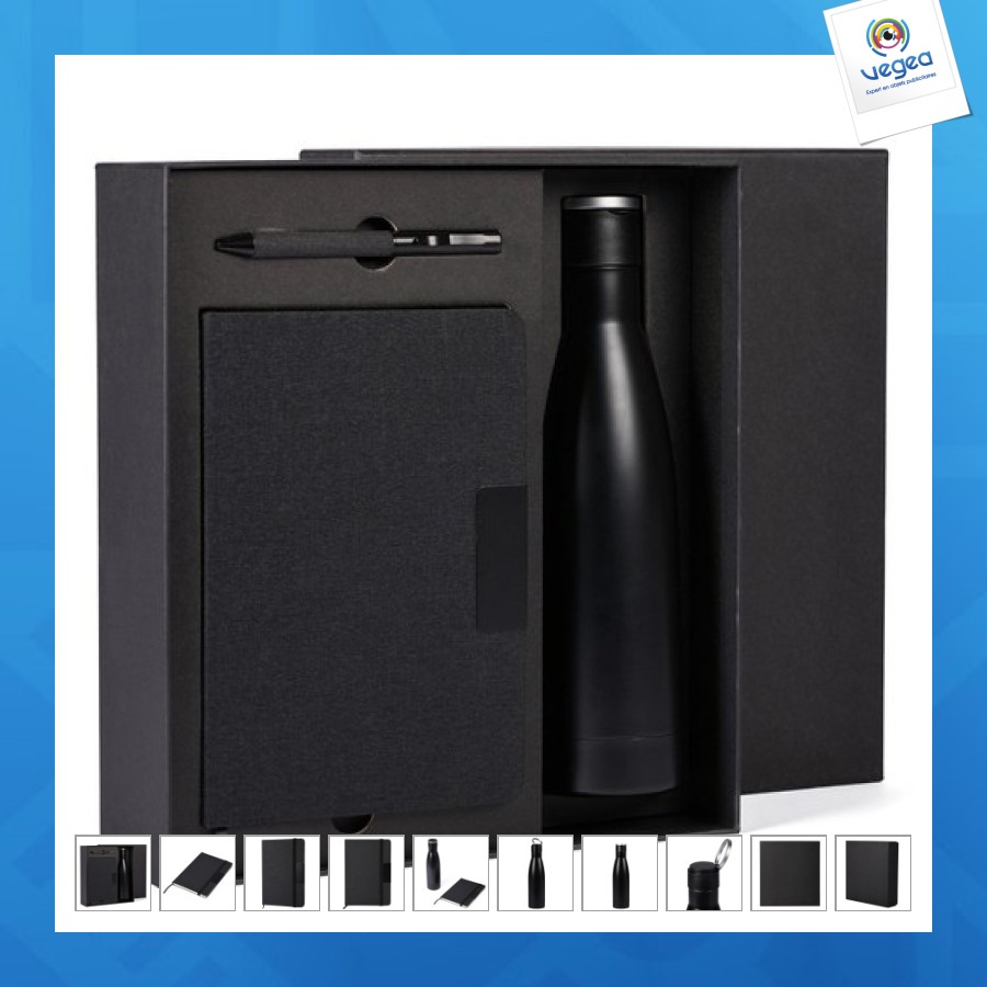 De la collection Save the planet, le set d'écriture avec bouteille thermique de 500 ml à double paroi isolante (B11801) est l'une des nouveautés de cette année, parfait pour ceux qui recherchent un cadeau élégant et durable.Ce set est idéal pour ceux qui souhaitent allier praticité et style, offrant une solution complète pour écrire et maintenir les boissons à la bonne température.Le set comprend un stylo à bille en métal recouvert de RPET, un bloc-notes en RPET avec insert en métal et une bouteille thermique en acier, le tout emballé dans un étui en carton.Il est possible de personnaliser le set avec une gravure laser pour une haute précision ou une impression sérigraphique pour des logos en couleurs unies. Matières : acier,papier,métal,RPET Informations complémentaires : 28x30x8 Dimension marquage : SLV1: 40x5 - 18x55 - 23x90, SSC: 90x50 Personnalisation 1 : SLV1 - Gravure laser articles divers Personnalisation 2 : SSC - Sérigraphie et confection Pour plus d'informations marquages, nous contacter.